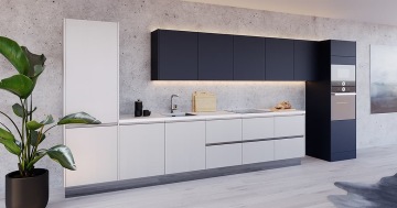 Model Silver Metal s leskem a strukturu broušené nerezi ve spojení s modelem Dark Ocean v tmavě modré barvě dají vzniknout moderní a elegantní kuchyni s puncem luxusu.