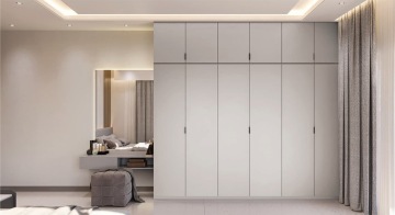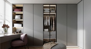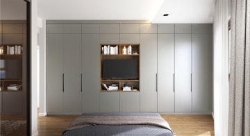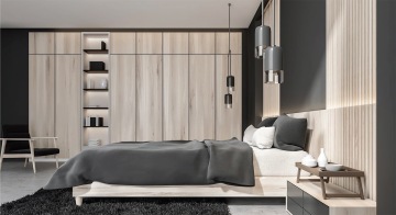 Hladké jemně matné dveře modelu Silk Touch v barvě Light Grey v ložnici představují moderní a nadčasovou šatní skříň sestavenou na míru až do stropu. Dveře se vyrábějí v několika rozměrových variantách a mnoha barevných či materiálových provedeních podle vzorníků Dolti nebo Dolti Collection.